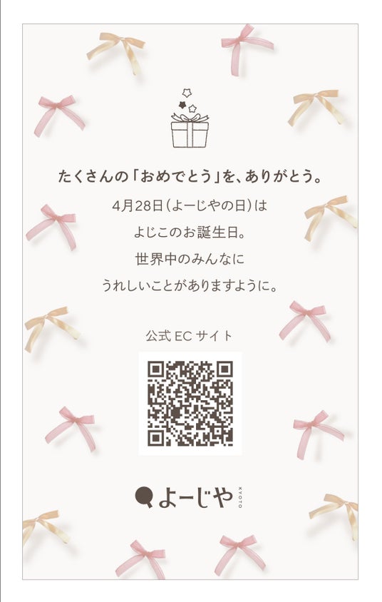 よーじやグループ(京都府京都市下京区、代表取締役・國枝昂)は、創業120周年を機に4月28日を「よーじやの日」として一般社団法人記念日協会より認定を受けました。いつもご愛顧いただいているみなさまに感謝を込めて、今年も「よーじやの日」を開催いたします。3回目となる今年のテーマは「よじこのHAPPY BIRTHDAY」。4月28日(よーじやの日)は、コーポレートキャラクター「よじこ」のお誕生日でもあります。限定のセットやバッグ、カフェメニューなどを販売いたします。年に一度の「よじこ」のお誕生日を一緒にお祝いしませんか?