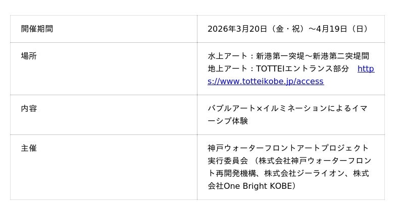 「KOBE BUBBLUMI 2026」は、GLION ARENA KOBEおよびTOTTEIの開業1周年とスーパーヨットマリーナ整備完了まで残り1年を記念して開催される、水辺空間を活用したイマーシブアートイベントです。新港第一突堤から第二突堤にかけてのエリアでは、シドニーを拠点に活躍するアーティスト「Atelier Sisu」によるバブルアートを展開。