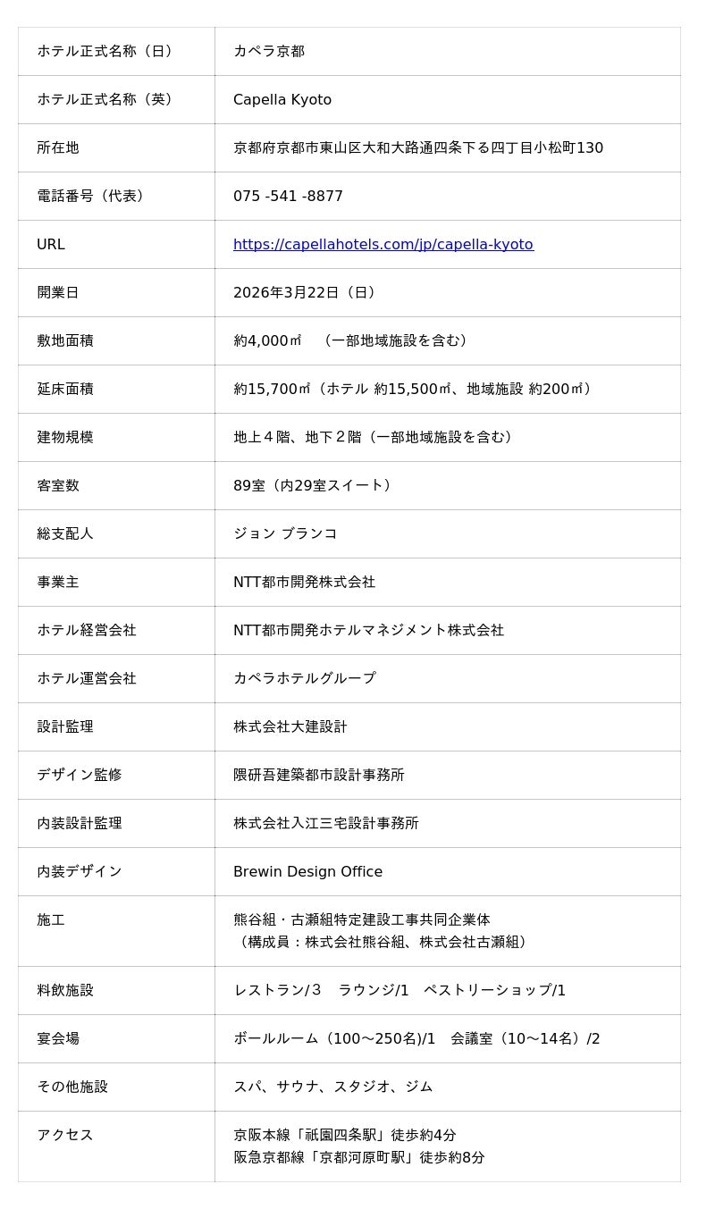 「本プロジェクトは、宮川町お茶屋組合や新道自治会をはじめとする地域の皆様の多大なるご理解とご協力のもと実現いたしました。この宮川町という歴史と文化が息づく特別な場所において、『街の記憶を受け継ぐこと』と『新たな価値を創造すること』を大切にしながら、カペラ京都が、お客様にとって心に残る場所となるとともに、地域の皆様に誇りに思っていただける存在となることを願っております。」
