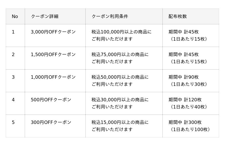 以下、開催期間中のクーポン詳細や利用条件・配布枚数になります。