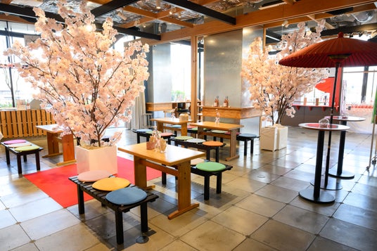 桜の装飾が施された会場