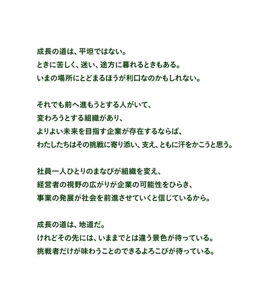 企業を取り巻く環境は、急速な技術革新や社会構造の変化により、かつてないスピードで変化しています。企業が持続的に発展していくためには、組織としての変革だけでなく、そこで働く一人ひとりが学び続け、挑戦し続けることが欠かせません。しかし、成長の道のりは決して平坦ではありません。ときには迷いや困難に直面し、立ち止まりたくなる瞬間もあります。それでもなお前へ進もうとする人や組織の挑戦に寄り添い、支えていくことこそが、当社の役割であると考えています。
