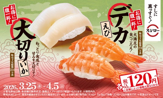 さらに、定番ネタの“えび”や“いか”が大きいサイズでお得に登場します。通常よりも大きいサイズの「デカえび」、大切りになった「大切りいか」が税込120円~で登場します。