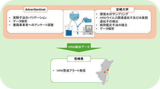 当社と宮崎大学は2024年6月より湖沼水からのHPAIウイルス検出手法の確立に取り組んでおり、採水・分析手法の確立、モニタリングデータ取得を完了しました。今後は新たに養鶏事業者へのアラート発信とその有用性検証を行います。