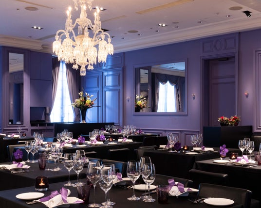 1994年に開業したフランスの古城を思わせるルイ15世王朝時代の建築様式を取り入れたシャトーの1階のラ ターブル ドゥ ジョエル・ロブション。フランスの伝統色であるラベンダーで統一された店内は上品で開放的な雰囲気に満ちています。