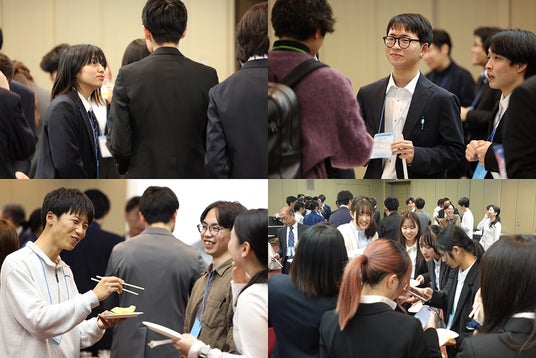 また、開会式前に行われたポスター発表では、熱のこもったディスカッションが繰り広げられ、交流会では、学生同士や企業の方と名刺交換をして活発な意見交換が行われました。連携を生み出すきっかけとなる機会が生み出されていたと言えます。