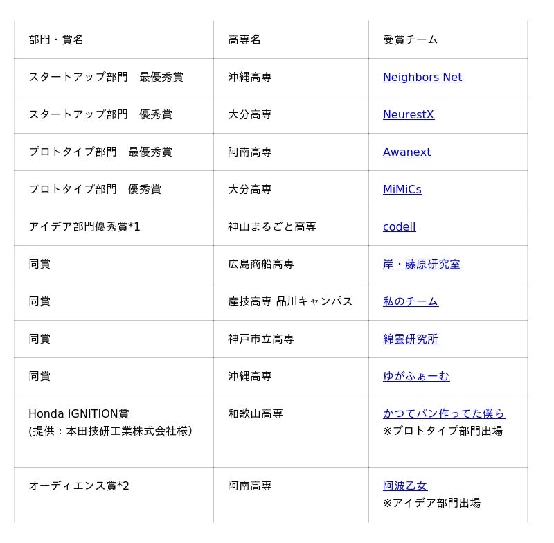 今回は、ビジネスプランの進行状況に応じた「アイデア部門」「プロトタイプ部門」「スタートアップ部門」の3つの部門を設け、より多くの高専生が参加できるようにしました。
