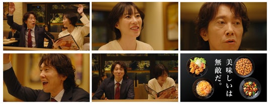 注文しようと「すみませーん!」と声を上げると、隣の女性客 (演:武内おとさん) の声とシンクロします。武内さんの「極王エビチリ、ジャストサイズで」の注文を聞き、「極王…じゃ僕も極王唐揚をジャストで!」と佐々木さんもつられて極王シリーズを注文。賑やかな餃子の王将の店内ならではの、クスッと微笑ましいひとこまです。