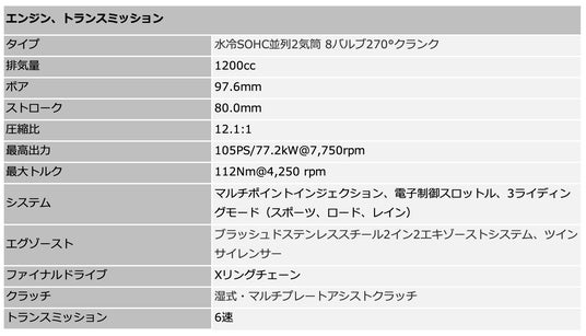 エレガントかつスポーティなスタイリングは、クリップオンハンドルによって生まれる低く構えたライディングポジションと、流れるようなシングルシートのシルエット。そして細部にまで行き届いた仕上げによって特徴づけられています。
