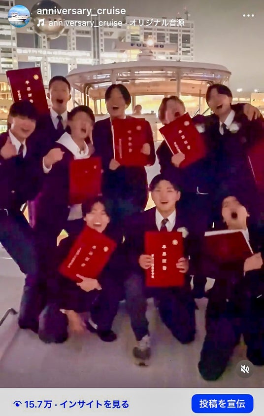公式Instagramで公開した船上での思い出づくりの様子を紹介するリール動画は、15万回以上再生を記録。卒業という人生の節目に、非日常の空間で「一生モノの記憶と絆」を残す体験として注目を集めています。