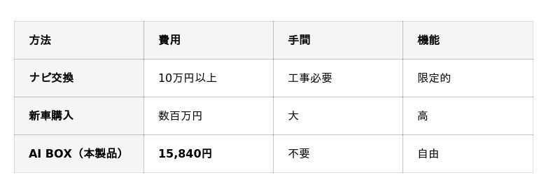 “ナビ買い替え”や“ディスプレイオーディオ導入”と比べて圧倒的に低コストでアップグレード可能