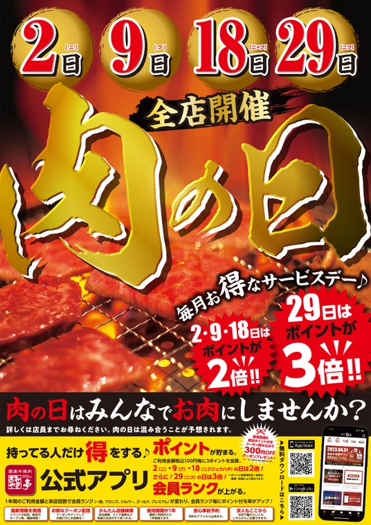 あみやき亭のアプリポイントは通常100円で3ポイントですが、毎月29日の【肉の日】はアプリポイントが100円で9ポイントとかなりお得にポイントが貯まります。