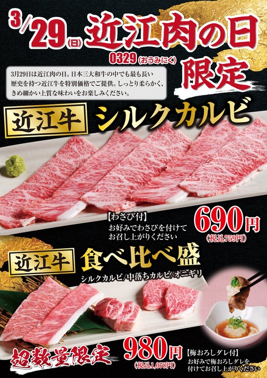 3月29日は“0329(おうみにく)”の語呂にちなみ、日本三大和牛のひとつである近江牛をお値打ちに楽しんでいただける特別な日です。