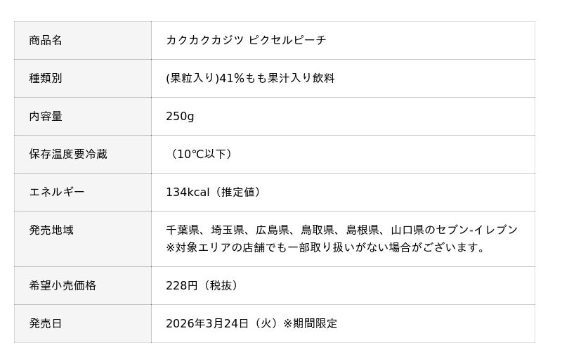 協同乳業株式会社(本社:東京都中央区、代表取締役社長:深松 聖也)と株式会社カヤック(本社:神奈川県鎌倉市/代表取締役CEO:柳澤大輔/以下「面白法人カヤック」)、株式会社セブン‐イレブン・ジャパン(本社:東京都千代田区、代表取締役社長:阿久津 知洋、以下「セブン‐イレブン・ジャパン」)は、果肉の食感を「ピクセル」として楽しむ新発想の果汁飲料「カクカクカジツ ピクセルピーチ」を共同開発しました。2026年3月24日(火)より、千葉県、埼玉県、広島県、鳥取県、島根県、山口県の6県限定でセブン-イレブン店舗にて期間限定で発売を開始します。