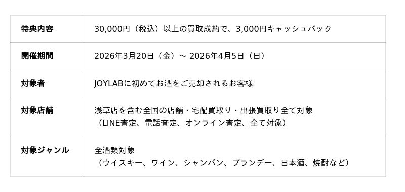 循環型マーケットデザインの株式会社オークネット(本社:東京都港区、代表取締役社長CEO:藤崎 慎一郎、以下:オークネット)の子会社で酒類の買取り・販売・酒類オークション運営を行うJOYLAB株式会社(本社:東京都港区、代表取締役社長:則竹 勇毅、以下:JOYLAB)は、2026年2月26日、東京都台東区浅草に「JOYLAB浅草店」をオープンいたしました。浅草店オープンを記念し、新規のお客様を対象とした「浅草店開店記念、キャッシュバックキャンペーン」を全店(宅配・店舗・出張買取全て対象)で同時開催いたします。