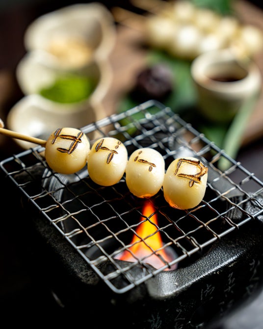 香ばしく焼き色がついていく様子や、立ちのぼる香りを楽しみながら、自分好みの焼き加減で仕上げていただけます。焼き上げた団子には、甘辛い特製みたらしダレをたっぷりと絡めてお召し上がりください。