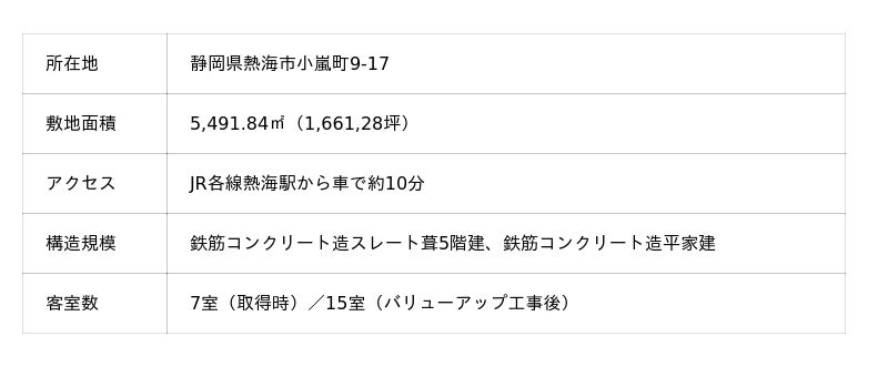 当社は、「MACHIづくり共創会社」として、地方創生および地域活性化を目的としたホテル・旅館等へ不動産投資事業を積極的に展開しており、本日付で静岡県・熱海エリアの中心地の小嵐町に位置する温泉旅館(既存施設名称:シオン熱海、以下「本物件」)を取得いたしました。