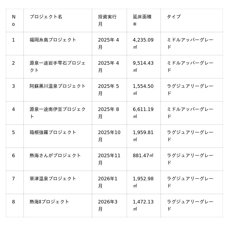 当社は、2025年4月より全国のホテル・旅館等への投資を開始し、国内機関投資家、金融機関等の協力を得ながら既に約200億円の投資を実行しております。さらにここから1年間で300億円の投資を計画しており、2027年3月期までには全国のホテル・旅館等へ 合計500 億円の投資を行っていく予定です。投資実行案件一覧