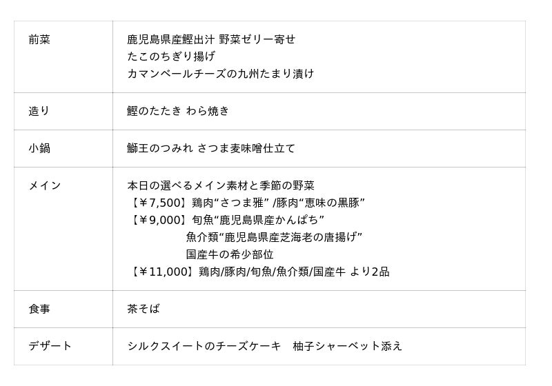 おいしいものの宝庫である鹿児島県の食材を、前菜、造り、小鍋、メイン料理、デザートで使用しました。メイン料理は料理長が厳選した数種類の食材の中からお選びいただき、炭火焼きや鉄板焼きなど食材に合わせた調理法で仕上げてご提供いたします。