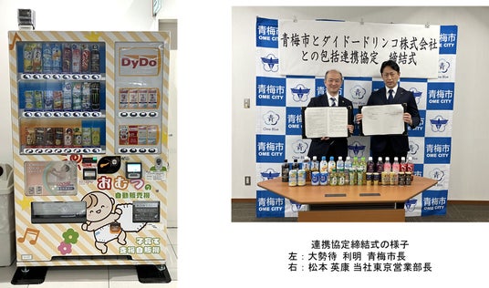 本連携協定に基づく取り組みの一環として、災害対応子育て支援型自動販売機(以下「本自販機」)を青梅市役所に設置しました。