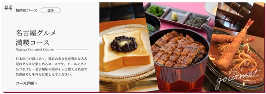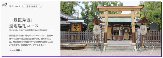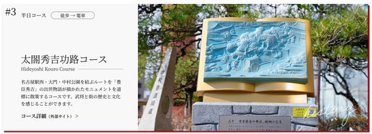 その成果として公開した「名古屋駅の宿」では、宿泊施設一覧に加え、「中村区街歩きコース」「『豊臣秀吉』聖地巡礼コース」「名古屋グルメ満喫コース」の3つのモデルコース+外部サイトへつながる 「太閤秀吉功路」を掲載しています。