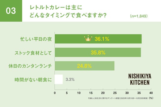 3) レトルトカレーは「忙しい平日の夜」に食べるが36.1%