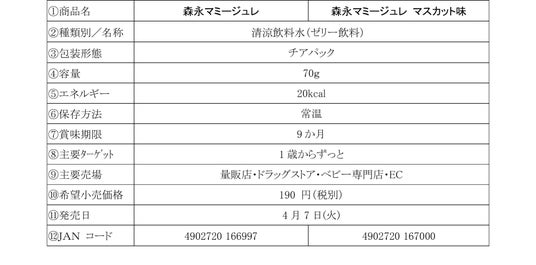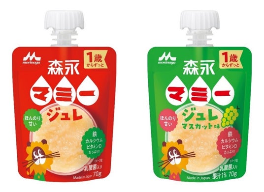 新商品「森永マミージュレ」「森永マミージュレ マスカット味」は、1歳からのお子さまの成長を応援するカルシウム、鉄分、ビタミンDを配合、さらに健康をサポートする「シールド乳酸菌(R)」を100億個配合したゼリー飲料です。