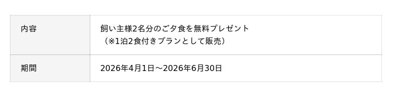 開業1周年を記念した第1弾プロジェクトとして、春の行楽シーズンに最適な「宿泊料金10%OFFプラン」を販売いたします。本プランは、決まった食事時間に縛られることなく、オーナー様と愛犬がそれぞれのスタイルで「一宮の春」を満喫できるプランです。