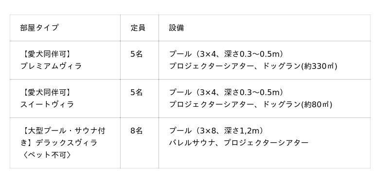 3.「完全プライベート」が生み出す 都会では味わえない静寂一棟貸切型のヴィラ内には、プライベートドッグラン、プール、バレルサウナを各棟に標準装備。他のゲストやワンちゃんを気にすることなく、春の柔らかな空気の中で、大切な家族だけの濃密な時間を過ごせます。