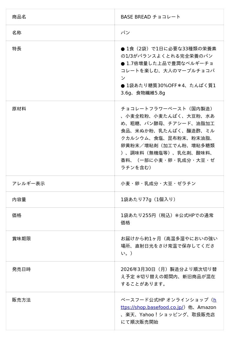 「かんたん・おいしい・からだにいい」をコンセプトに、1食(2袋)で1日に必要な33種類の栄養素の1/3がバランスよくとれる「BASE BREAD」シリーズ。「BASE BREAD チョコレート」は、全粒粉ベースのパン生地とチョコレートの風味を楽しめる商品として、シリーズ内で最も人気の高い商品です。 BASE BREADを体験したことのない方や、一度離れてしまわれたお客さまに向けて、改めてBASE BREADの魅力を知っていただくために、シリーズの顔でもある「BASE BREAD チョコレート」の大幅なリニューアルを行いました。
