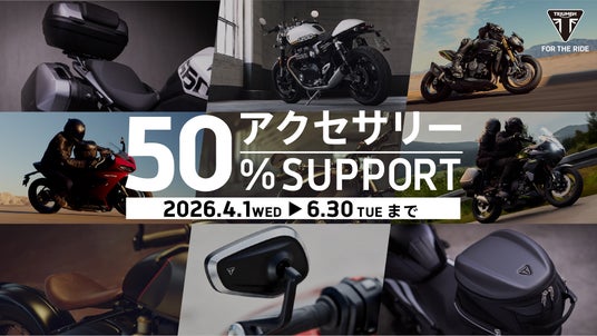 トライアンフモーターサイクルズジャパン株式会社(本社:東京都港区海岸 代表取締役社長:大貫陽介)は4月1日(水)~6月30日(火)までの期間中、全国のトライアンフ正規販売店にて「アクセサリーご購入50%サポートキャンペーン」を開催することをお伝えします。