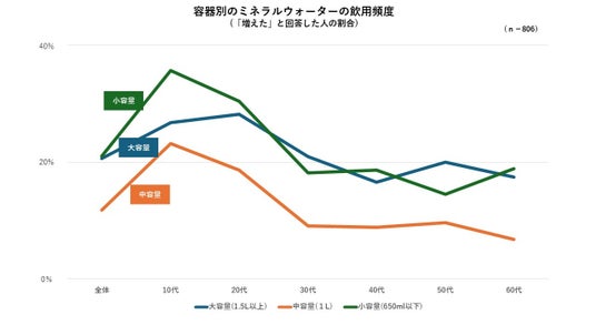 ・ミネラルウォーターの飲用(利用)頻度は、「ほとんど毎日」が最も多く、36.5%でした。容器別の飲用(利用)頻度では、全容量において、10代~20代の飲用頻度が増加傾向にあり、特に中容量・小容量においてはその傾向が顕著に見られました。若年層を中心にパーソナルサイズの需要が拡大しているものと見られます。
