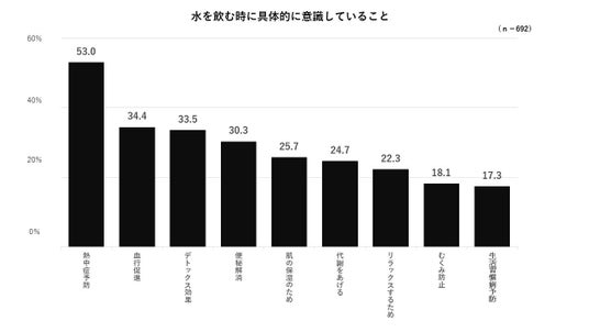 ・「水を飲む時に体のことを意識している」人は約7割(69.2%)でした。具体的な理由として、「熱中症予防」が最も多く挙げられた一方、「デトックス効果」「肌の保湿」なども理由として挙げられ、特に女性は健康や美容への意識と結び付く傾向が見られました。