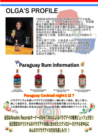 ■■■パラグアイ共和国とラム南米大陸の中心に位置するパラグアイ共和国。日本では馴染みが薄いように思えますが、日本との交流自体は1912年から続いており、今現在も一万人程の日系パラグアイ人が住んでいます。またオルガさんのように日本に住み続けているパラグアイ人も増えています。つい最近も2018年に日本からの経済・医療支援を行いました。パラグアイでの主な農産物はマテ茶ではありますが、ステビア(甘味料の原料)が特産のひとつでもありますし、ラムの原料となるサトウキビ生産も盛んです。ステビアは多くの缶飲料・清涼飲料に用いられてもいます。そんなパラグアイで作られたラムは、香りもほのかでしつこくなく、味わいも爽やかな甘めで飲みやすいものとなっています。イベント当日には、パラグアイ・ラムをそのまま楽しんでも頂けますし、オーナーバーテンダーであるSHI-TAKA(代表取締役 濱口 貴志)の考案による、オリジナルミクソロジーカクテル、さらにはそれにペアリングできるパラグアイの料理(アルポンティガス・マリネーラ等)を存分に楽しめます。