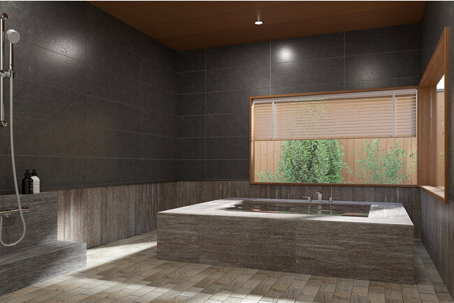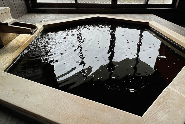 希少な黒色の天然温泉が満ちる専用の温泉風呂はお好きなタイミングで何度でもご入浴頂けます。