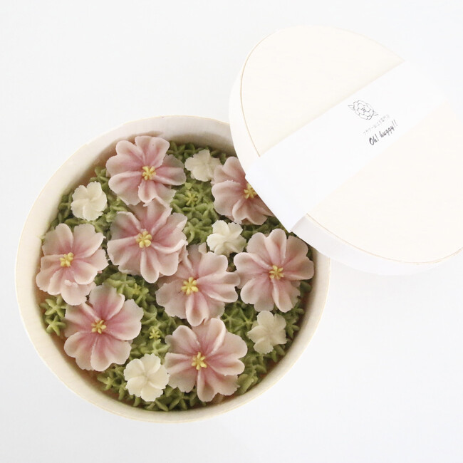 ストロベリー餡でカバーしたおはぎの上に抹茶餡を絞り出し、菜の花・桜・小花を敷き詰めました。