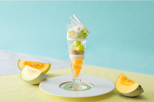ホテル開業より大人気スイーツの“大人のご褒美パフェ”。第49弾目の今回は、旬の“メロン”をテーマに、爽やかな青肉メロンと甘みの強い赤肉メロンを両方使用した贅沢パフェに。パフェ上段には、青肉のフレッシュメロン、メロンシャーベット、ココナッツのメレンゲなどを配置。