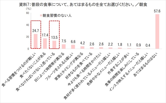 朝食習慣のない人のうち、24.7%が朝食について「習慣をつけるのが難しい」、13.5%が「食べなければいけないと思っている」と回答しています。(資料7)