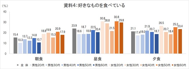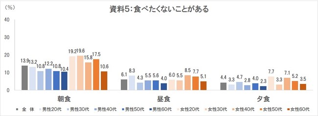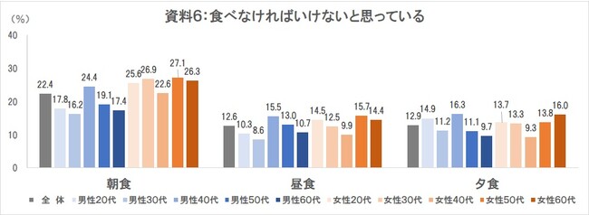 普段の食事について、朝食、昼食、夕食のうち、「楽しみながら調理している」(資料2)「食事の時間を楽しみにしている」(資料3)「好きなものを食べている」(資料4)の項目で全世代において、朝食が最も低い数値となっています。なかでも40代女性では「楽しみながら調理している」が2.3%、30代の男性は「朝食の時間を楽しみにしている」が6.8%と特に低い数値となりました。一方「食べたくないことがある」(資料5)「食べなければいけないと思っている」(資料6)の項目では、3食のうち、朝食が全世代で最も高い結果となっています。以上の結果から、朝食は“食べなくてはいけない”という気持ちが強く、食事として楽しめていないことがうかがえる結果となりました。