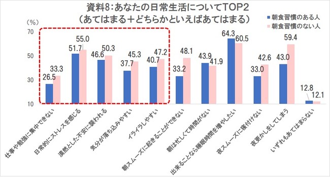 朝食習慣のある人は、習慣のない人と比較して、日常生活の悩みに関する項目のスコアが低い傾向となりました。(資料8)