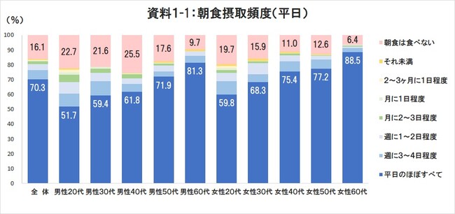 朝食の喫食頻度は、「平日ほぼすべて」食べると答えた人が、全体で70.3%となった。一方で20代では、男性51.7%、女性59.8%と年代が下がるほど少なくなる傾向に。