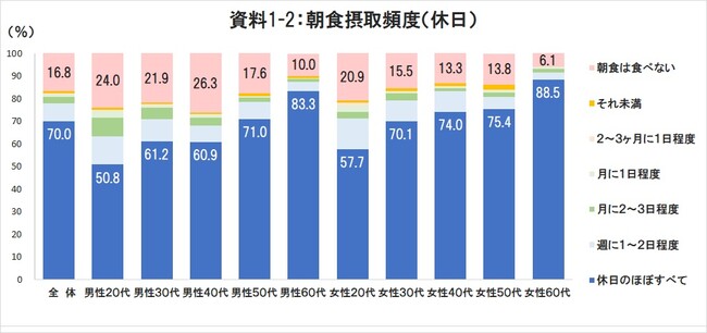 自宅で朝食を取る頻度について、「平日のほぼすべて」と答えた割合は、全体で70.3%、60代が男性81.3%、女性88.5%と高い結果となりました。一方20代では、男性51.7%、女性59.8%と年代が下がるほど少なくなっています。「朝食は食べない」と答えた割合は、平日・休日ともに、男性では40代、女性は20代が最多となりました。(資料1-1,2)