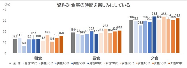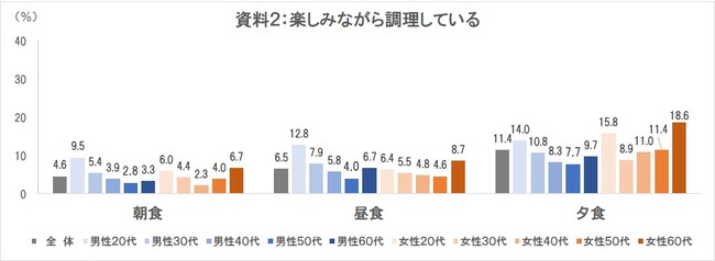 朝食は“食べなくてはいけない”が、“楽しもう”という気持ちを上回っている食事。中でも40代女性は、ほぼ朝食を楽しみながら調理することができておらず、30代の男性は「朝食の時間を楽しみにしていない」傾向に。