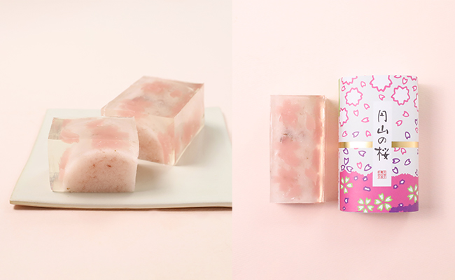 桜の塩漬け入りの餅羊羹の上に、琥珀羹を流し、花びらをかたどった羊羹を浮かべました。桜の美しさと儚さがぎゅっと閉じ込められた一品です。京都の桜の風景を思い浮かべながらお召し上がりくださいませ。