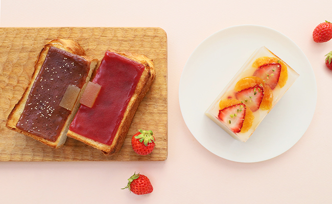 当店で人気を誇る「スライスようかん」には、春季限定のベリー味をご用意しました。いちごとラズベリーを白あんに合わせた、甘酸っぱくフルーティーな「ベリー羊羹」と、定番の丹波大納言小豆を使用した「小倉羊羹」の半分ずつになっており、1枚で2つの味をお楽しみいただけます。