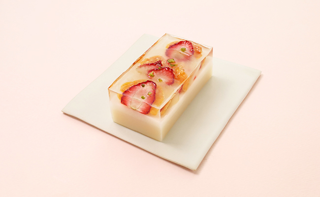 いちごと相性の良いホワイトチョコレート入りの白羊羹の上に、もっちりとした食感の「餅羊羹」と、いちご、