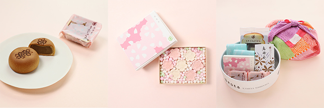 その他にも、春らしい商品がラインナップ。黒糖こしあん製の代表銘菓「烏羽玉」がおまんじゅうになった「烏羽玉まんじゅう さくら」、メッセージカード付きの小箱に、桜型の和三盆を詰めた「暦 花見月」や、定番から春の銘菓までをひと箱に揃えた「お花見セット」などを展開しています。