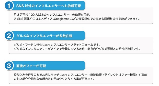 月額3万円で100人以上のインフルエンサーへ依頼することも可能です。各種SNSに加えて、口コミメディアやGoogleMap等の媒体への投稿も同じ料金で実施できます。