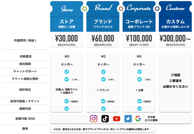 店舗規模、会社規模に合わせて、最適なプランをお選びいただけます。複数店舗をお持ちの企業であれば、チケットを自由に分配可能なコーポレートプランがおすすめです。ブランド展開されている店舗であれば、同一ブランドであれば何店舗でも可能なブランドプランもございます。