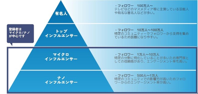 さらに、登録インフルエンサーは、フォロワー数が500~10万人のナノ~マイクロインフルエンサーが中心。特定の分野に特化し専門家としての信頼感があり、特定のコミュニティへの影響力が強いためエンゲージメント率が高くなる傾向にあります。